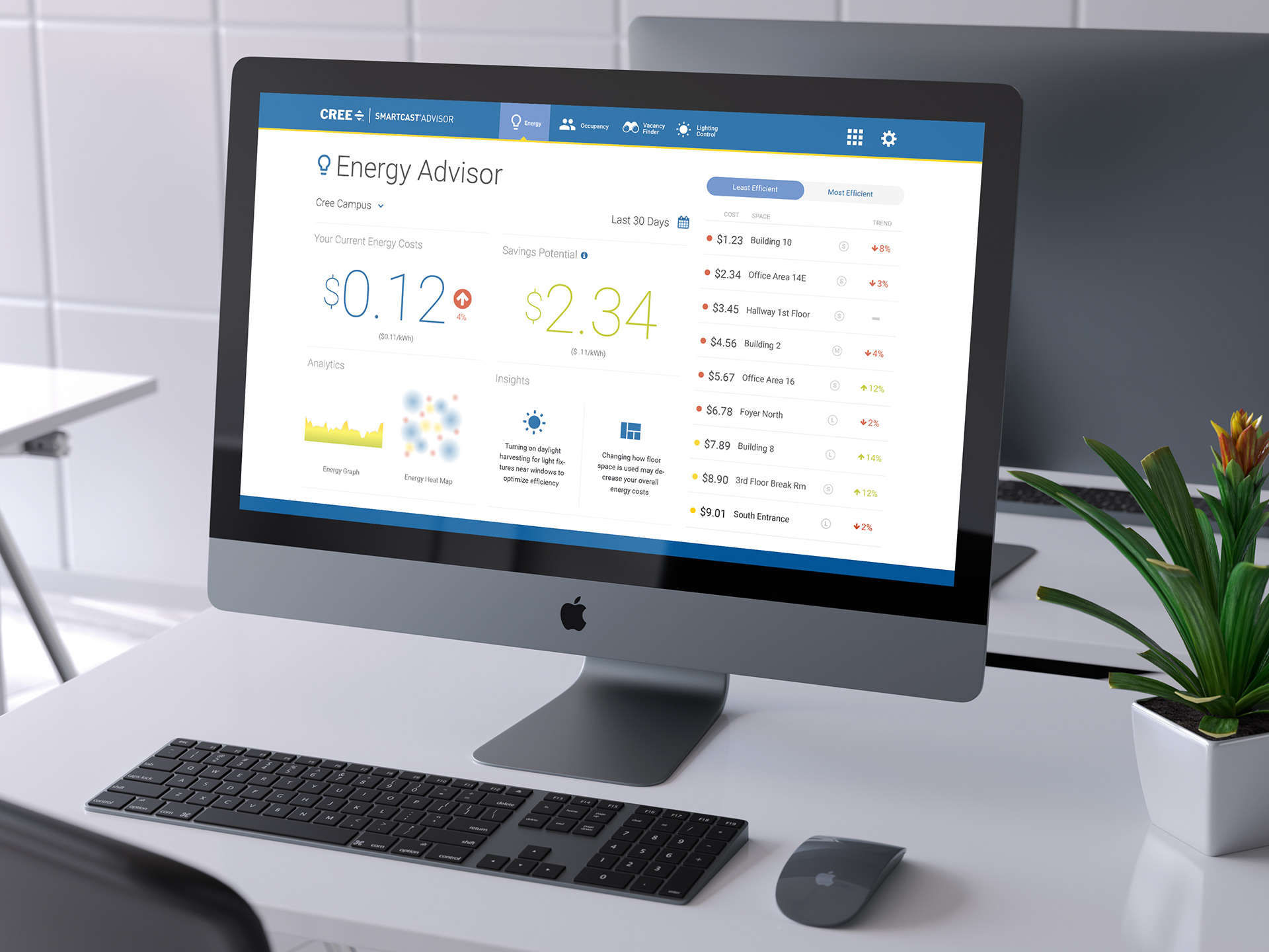 I was hired as Cree's first head of User Experience as the company develops its IoT platform and applications. I helped envision the SmartCast Advisor platform to help companies analyze their energy and occupancy efficiency as well as incorporate additional apps for even more robust features – from Dynamic Lighting to Security Alerts.